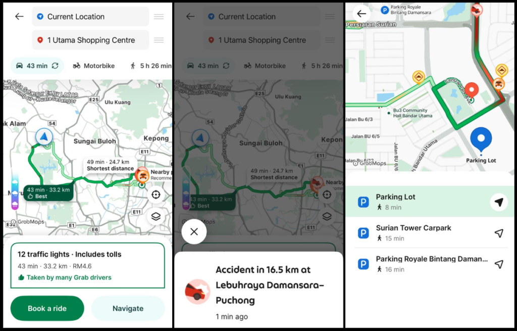 BTW, something really cool about GrabMaps is it shows you how many traffic lights are on your route, how much toll you need to pay, accidents, and also parking spots!