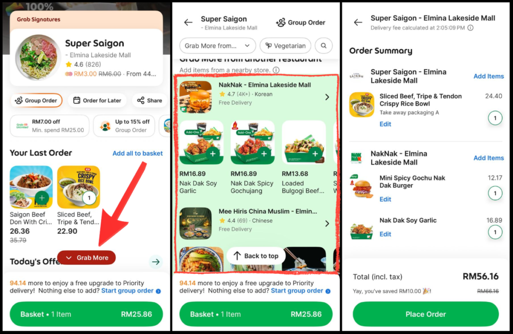 Once you click on it, Grab will show you a list of nearby restaurants that your abang rider can easily swing by. Just add your second order, and both will arrive together – saving you that extra delivery fee!