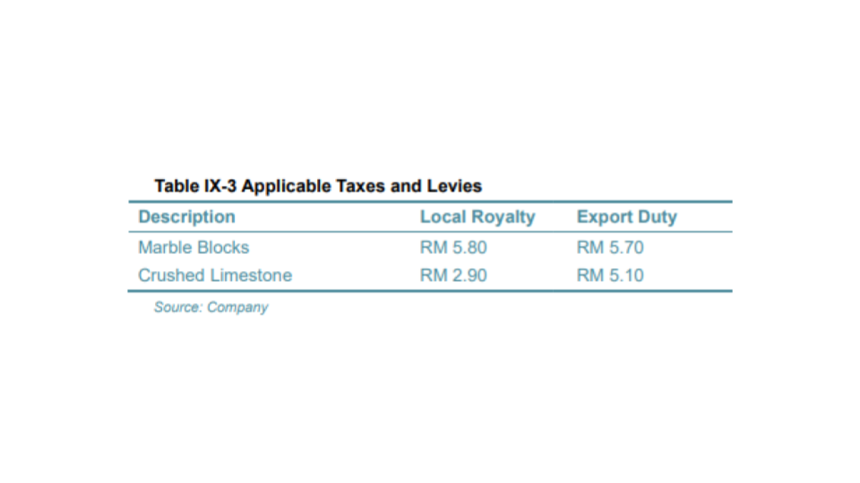 The only detailed figure publicly available comes from a 2021 report prepared for GCCP Resources (Malaysia’s largest crushed limestone producer listed in Singapore). According to that document, limestone royalties paid to the state were around RM2.90 per tonne, with export duties at RM5.10 per tonne.